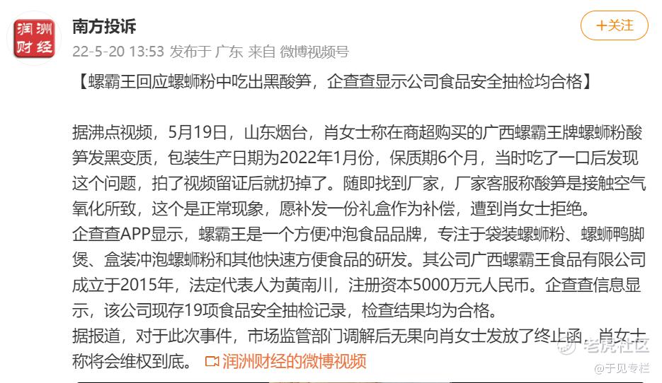 就在2022年5月中旬,南方投诉微博报道,有消费者购买的螺霸王螺蛳粉发黑变质,但是拍完视频留证后就将螺蛳粉丢掉了。由于没有“物证”,且企查查显示,公司食品安全抽检均合格,该消费者也投诉无门。