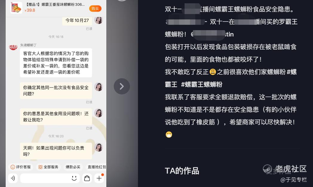 例如,在某音上,就有这样一条热门视频,某消费者晒出了与螺霸王客服的聊天记录,表示双十一期间在淘宝某头部主播的直播间购买的螺蛳粉,包装破损疑被老鼠啃食,希望商家排除该批次产品的安全隐患。