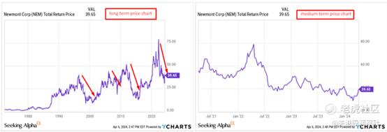 黄金仍然是一种避险资产,由于持续的地缘政治紧张局势和美国利率可能会下降,黄金目前的交易价格在每盎司2000美元以上——从逻辑上讲,这对纽蒙特来说是一个非常积极的信号。但如果我们不只看短期时间(1周—3个月),而是看中长期价格走势图,股价几乎不会对这种催化剂做出反应。从周期性的角度来看,与过去几十年一样,纽蒙特正处于低点;
