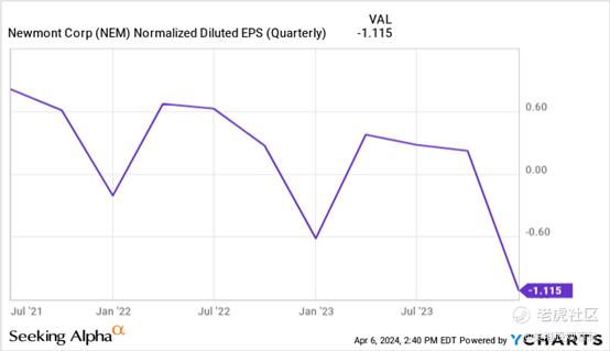 该公司于2024年2月22日公布了其2023财年第四季度财报,收入和每股收益数据均超出了市场预期,销售额同比增长23%。尽管收入有所增长,但纽蒙特仍然警惕地管理开支:其调整后的EBITDA达到约14亿美元,利润率小幅收窄至34.9%。因此,我们看到每股盈利的绝对数字在恶化: