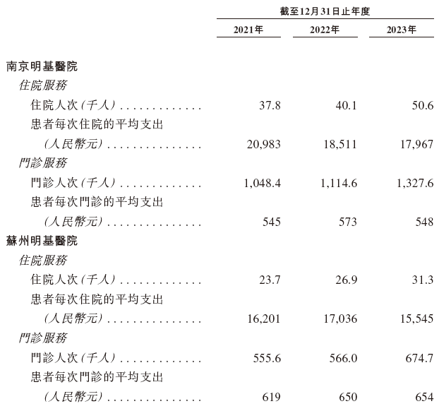 根据弗若斯特沙利文的数据,以2022年每张登记床位的平均收入计,明基医院在中国内地所有民营营利性综合医院集团中排名第一。截至2023年12月31日,明基医院两家医院总运营面积合计约38万平方米,总注册床位数1,850张,拥有930人的医生团队(包括298名主任和副主任医师、304名主治医师、328名住院医师)、1722名其他医疗专业人员,其中包括35名来自中国台湾和海外的专家。2023年,明基医院的门诊就诊次数超200万人次,年住院手术量超20,000例。