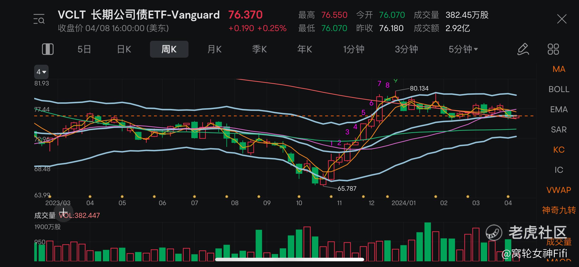 我们从周K线上看到VCLT在过去一年中,价格起伏较大。但从去年十月中下旬后,价格突然连续拉升,一路推高,虽然今年初略有回调,但目前仍在高位。