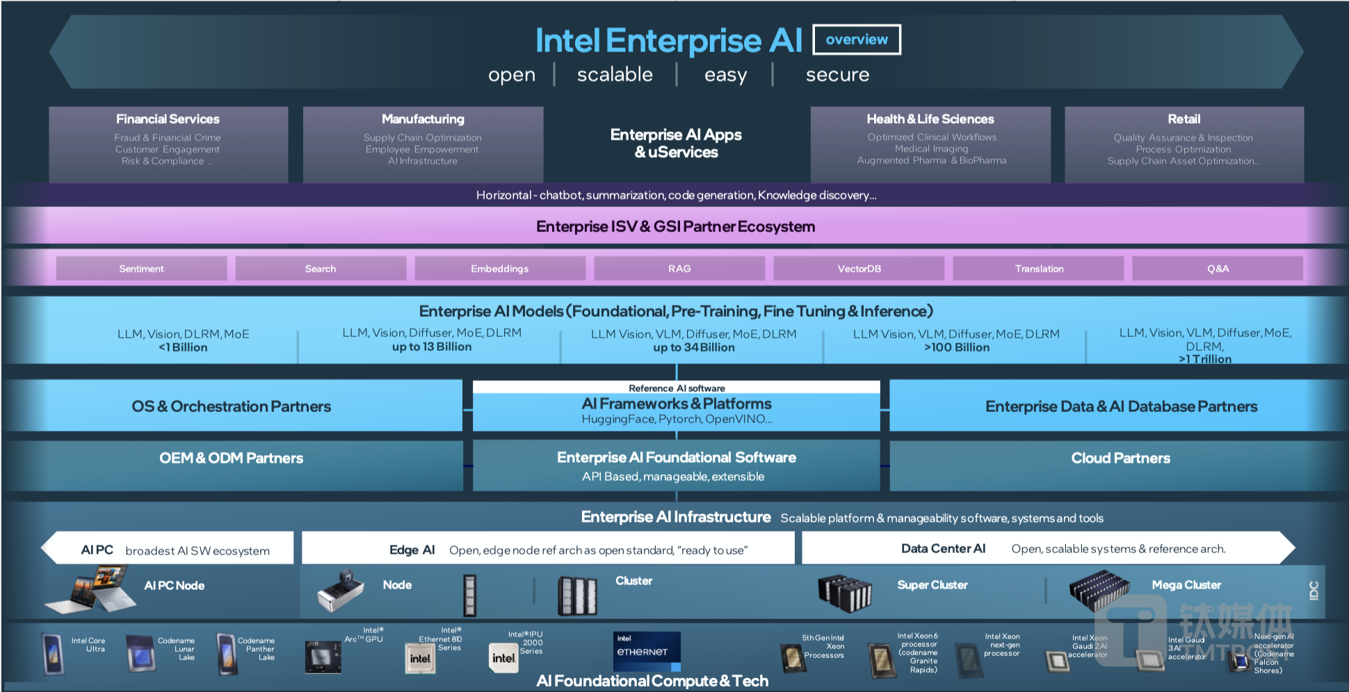 英特尔强调,公司不仅将提供包括硬件、软件、框架和工具,而且希望设备制造商、数据库提供商、系统集成商、软件和服务提供商等参与其中,推动英特尔AI开放生态系统的构建,以及将生成式AI技术进行场景落地。