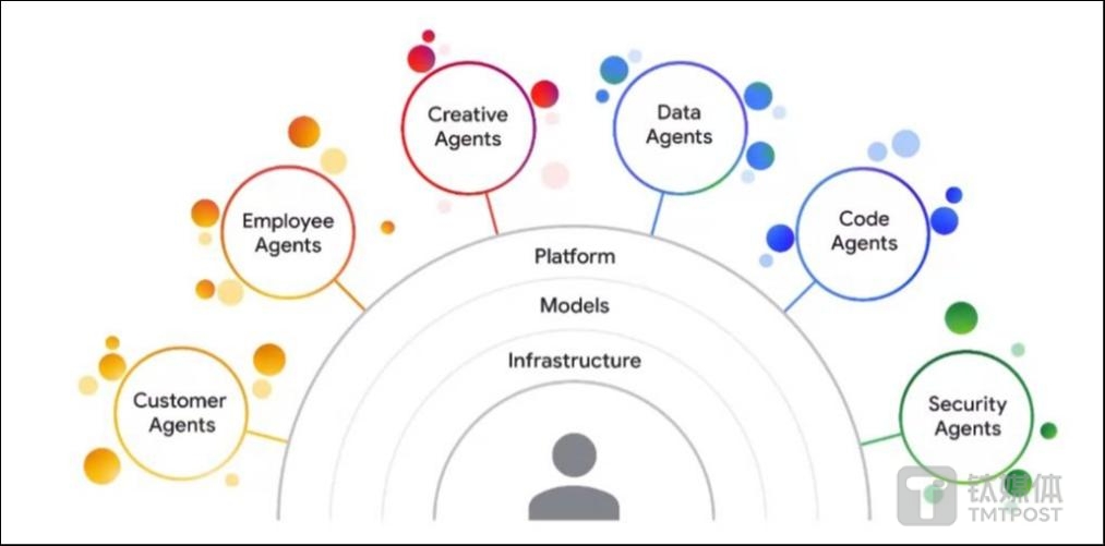 - 应用层:谷歌提供Gemini for Cloud、Workspace & Agent等产品组合中,即Gemini AI 产品将全面集成到 Cloud 与 Workspace 两大产品线,而且还预开发了一堆 AI Agent(代理),支持客服、雇员、创意、代码、数据、安全代理等等。