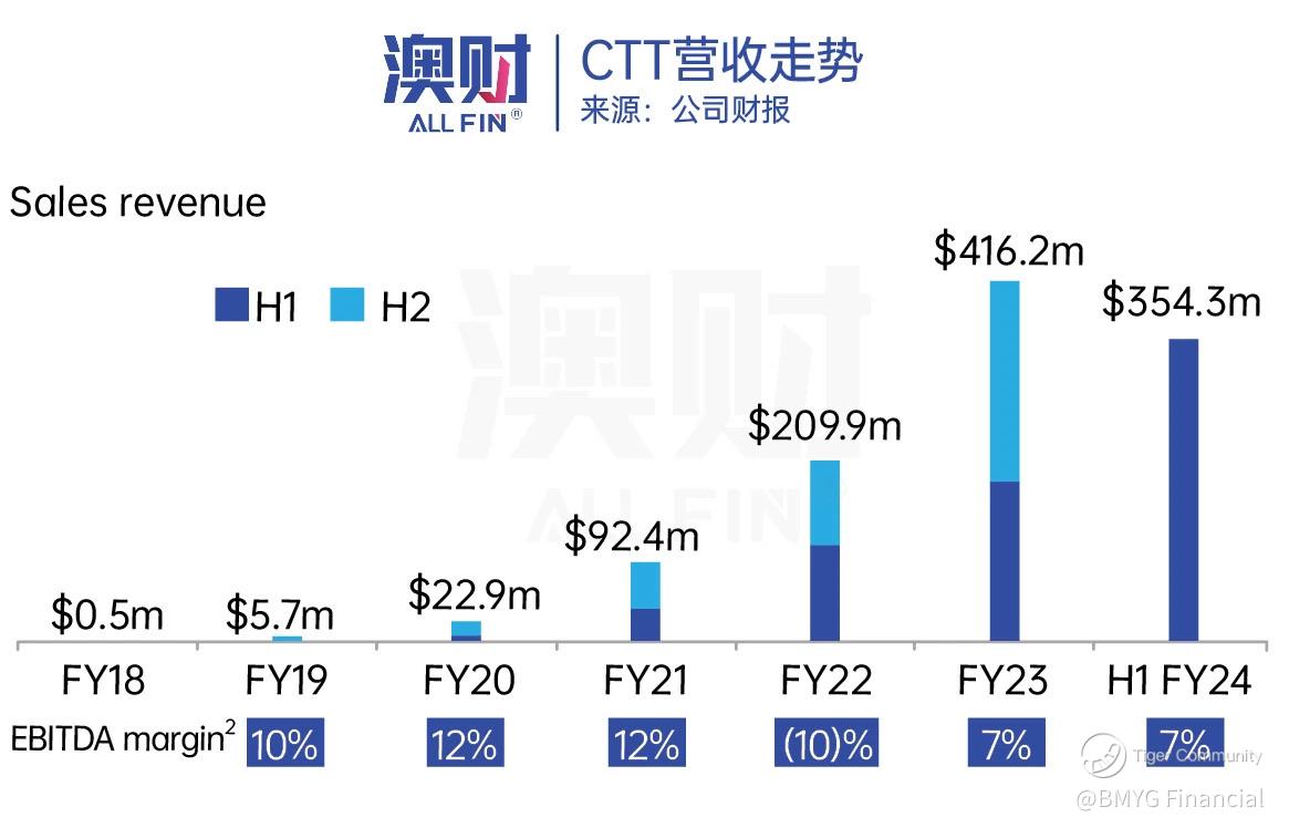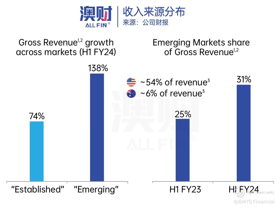 虽然CTT在澳洲上市,但其主要的消费者都来自于澳洲之外。在24年上半财年中,CTT收入54%由美国贡献,澳洲仅占6%。美国的消费能力毋庸置疑,更关键的是,CTT在新兴市场增长也相当不错,贡献收入占比从25%增加至31%。
