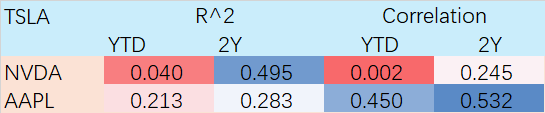 统计了一下相关性,NVDA于TSLA的今年年初以来的相关性仅仅为0.002,而过去两年的平均为0.245