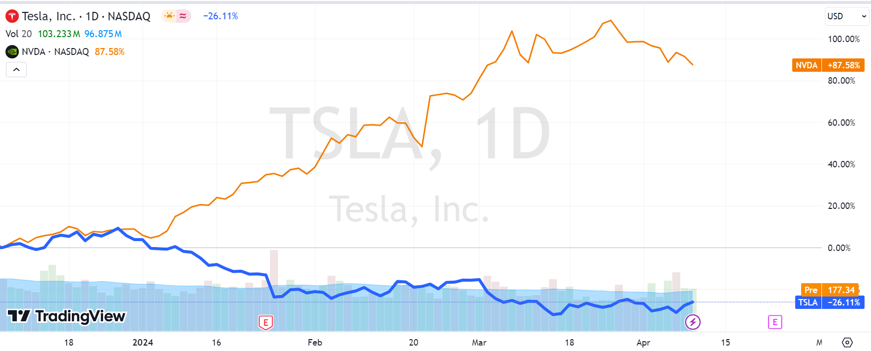 前三个月NVDA无限风光,TSLA股东备受折磨。进入4月,TSLA反而逆势回升。