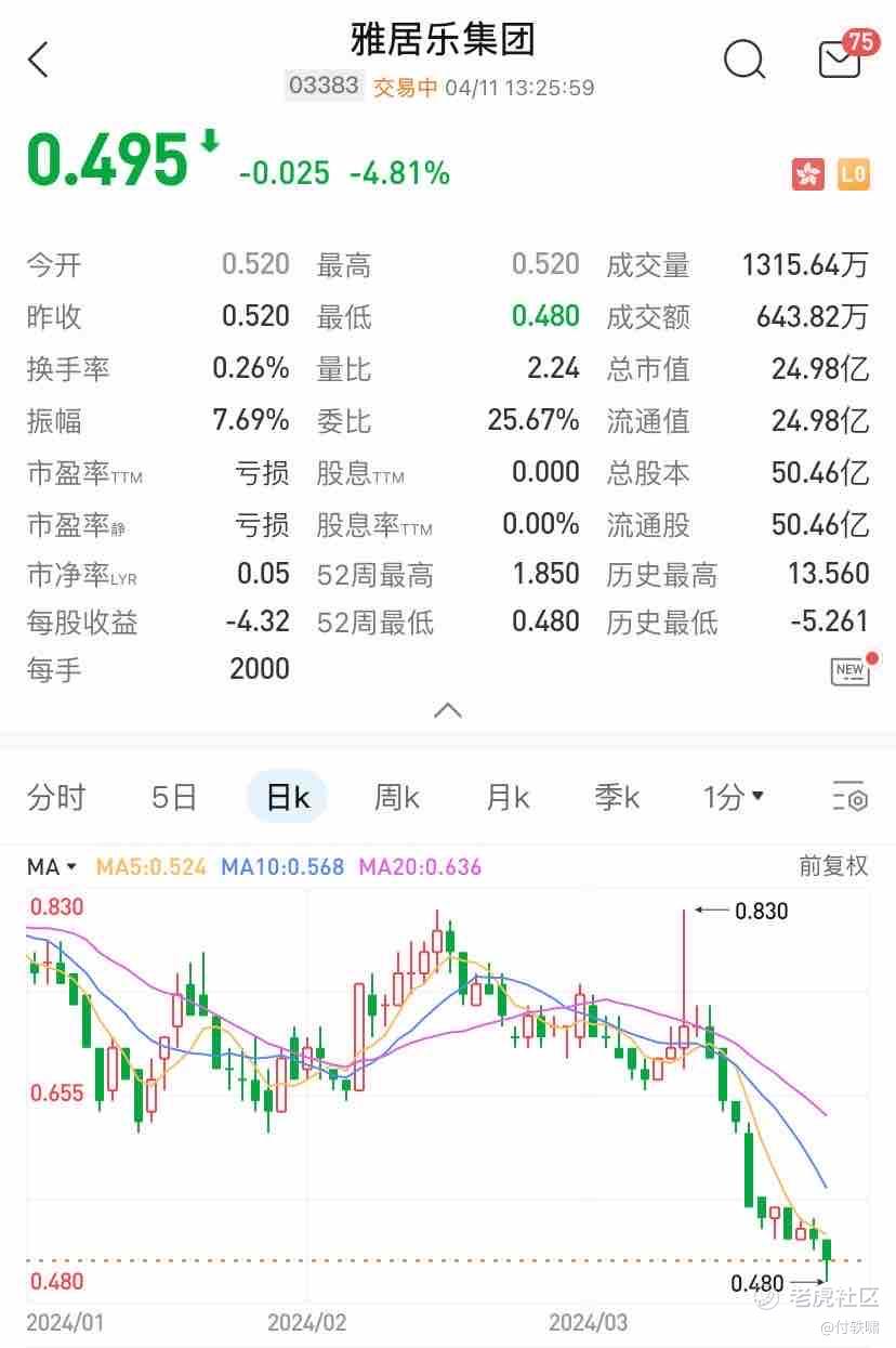 近日,雅居乐集团(03383.HK)的股价在资本市场掀起了一阵波澜。4月11日,该股盘中快速跳水,跌幅达到4.81%,现报价0.495港元,如此大幅的股价波动,不仅引发了市场的广泛关注,也让投资者对雅居乐集团的未来走势产生了疑虑。