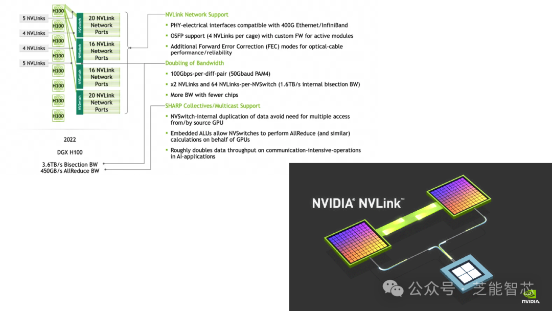 NVLink利用了Ethernet生态的成熟互联技术,但并未完全遵循Ethernet的规范,采用了不同的调制方式以降低时延。这使得NVLink在速率和时延上都具有优势,逐渐成为了PCIe的竞争对手。