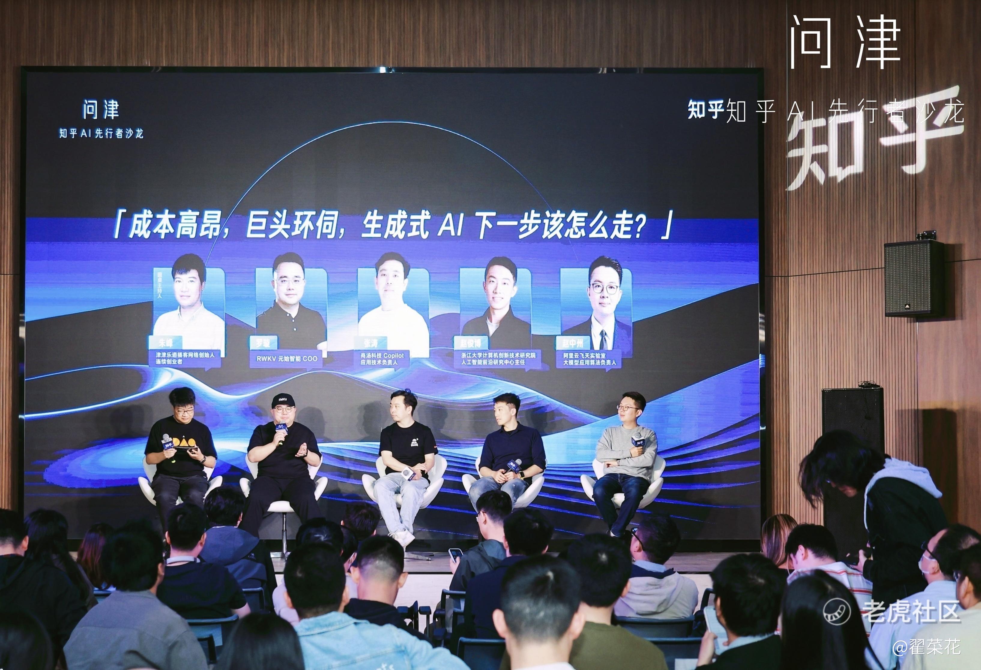 在众嘉宾主旨演讲结束后,“知乎AI先行者沙龙”还举行了一场主题为“成本高昂,巨头环伺,生成式 AI 下一步该怎么走?”的圆桌对谈,由津津乐道播客网络创始人朱峰主持,对话RWKV元始智能COO罗璇、浙江大学百人计划研究员赵俊博、阿里云飞天实验室赵中州等各AI专家,进行了一场精彩的思想碰撞与交流。