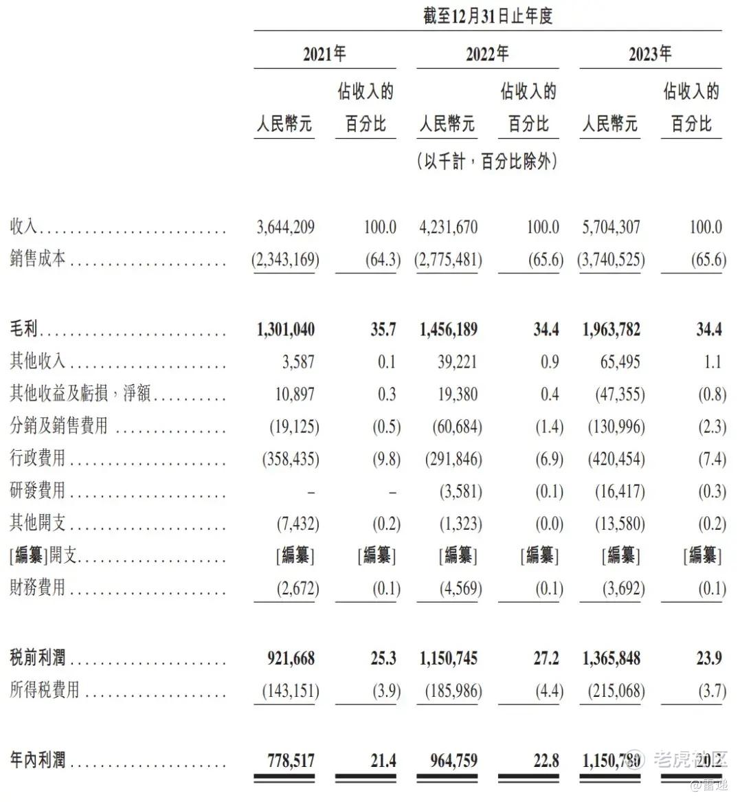茶百道2021年、2022年、2023年期内利润分别为7.79亿元、9.65亿元、11.51亿元;年内利润率分别为21.4%、22.8%、20.2%。