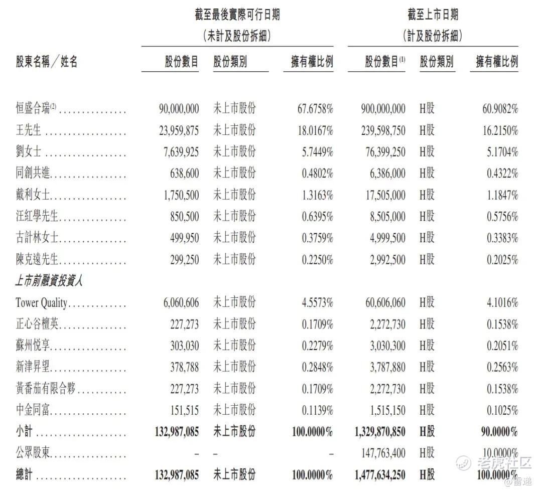 IPO后,恒盛合瑞持股为60.9082%,王霄锟持股为16.215%,刘洧宏女士持股为5.1704%,同创共进持股为0.4322%;