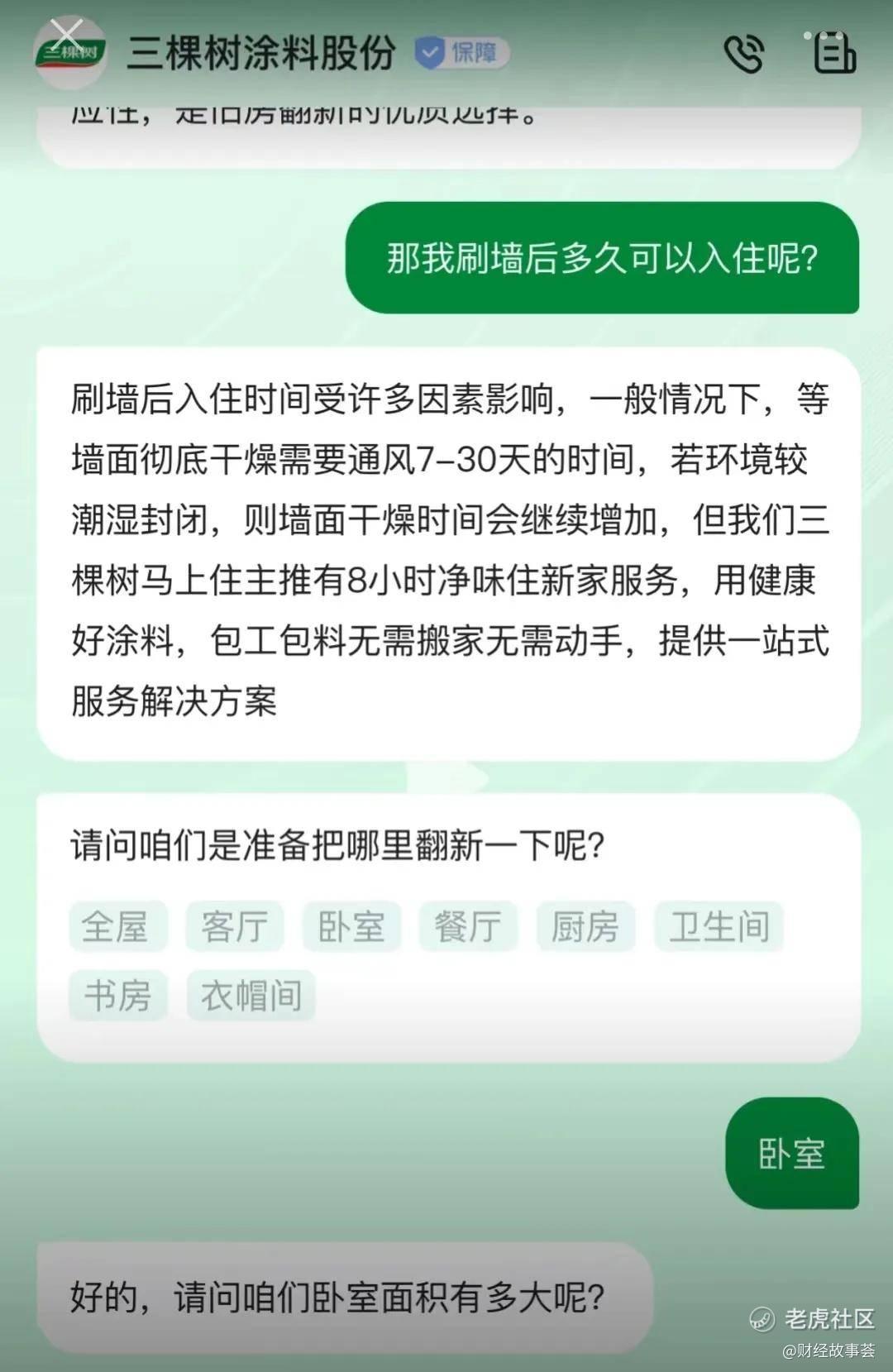 比如,在品牌三棵树的智能体对话中,用户咨询“我刷墙后多久可以入住?”,智能体会在回答行业知识的同时,洞察到商机,主动为用户推荐三颗树的健康涂料。