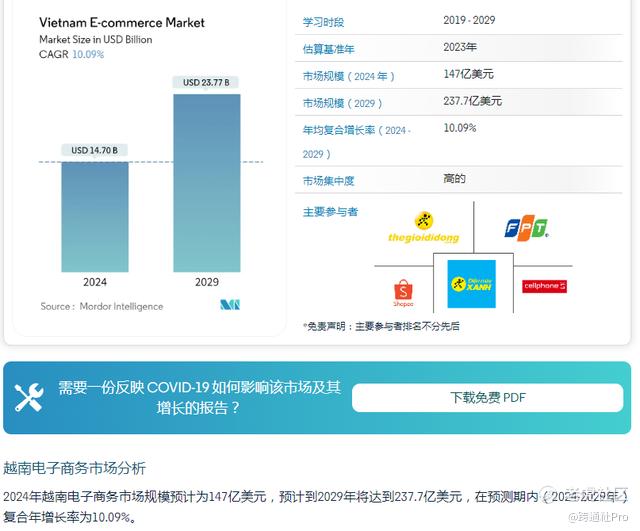 来自Mordor Intelligence发布的报告显示,由于数字支付的兴起以及区域电商平台的迅猛发展,越南电商市场得到了滋养,市场规模逐渐扩大。2024年,越南电商市场规模有望达到147亿美元,这一数字在2029年或将突破237亿美元。在2024年至2029年期间,这一市场规模的复合年增长率高达10.09%。