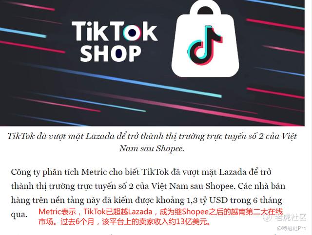 根据分析公司Metric发布的数据显示,TikTok已超越Lazada,成为继Shopee之后的越南第二大在线市场,过去6个月,该平台上的卖家收入约13亿美元。