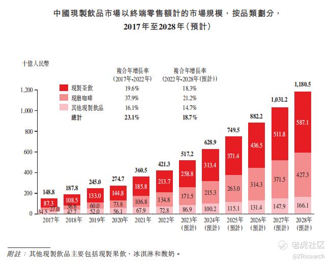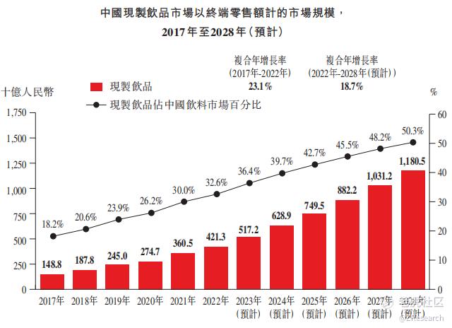 现制饮品指现场制作的非酒精饮料产品,包括现制果饮、茶饮、冰淇淋及咖啡等。以终端零售额计,中国现制饮品市场的规模预计将从2022年的4,213亿人民币增长到2028年的11,805亿人民币,复合年增长率达到18.7%,远超预包装饮料行业同期5.0%的复合年增长率。预计到2028年,中国现制饮品行业将超越预包装饮料行业,并占据中国饮料市场一半以上份额。
