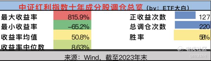 来源:ETF大白,已获授权转载,略有删改 我们都说红利策略自带“高抛低吸”属性,那么实际的数据是怎样的?我们一起来看看: 一、股息率加权——红利策略“长牛”的终极密码 红利策略类指数,以中证红利ETF515080追踪的中证红利指数为代表,采用的是“股息率加权”的方式。 加权就是给每只成分股赋予的权重,也就是每只成分股在整个指数中仓位的多少。 股息率加权,股息率高的重仓,调仓时买入的股票就多; 反之轻仓,调仓时卖出直至清仓。 而股息率=D/P=单位分红/单位股价 要想比值大,要么分子越大,要么分母越小。 为了分析买卖行为,我们来关注分母,也就是股价的变化。 用控制变量法假定分子(单位分红)不变,因此在调仓换股时,将分母越小(即股价越低)的票买入,分母越大(即股价越高)的票卖出。 这样,对股息率高的个股赋予更高仓位, 从加权方式上实现了“股息率加权”,从价格变化上实现了“低买高卖” ——这长期看大概率赚取了正差价,也就是长牛的“永动机效应”。 当然,进一步延伸,分子分母同除以单位盈利E 股息率=(D/E)/(P/E) 分母是PE估值的公式,分子是分红率的公式;根据红利指数规则,分红率高的入选。 在股息率加权的模式下,每次调仓也实现了“低估的调入、高估的调出”。 当然,在赚取了差价收益的基础上,红利策略通过选取股息率最高的一类股票,又赚取了红利收入,将股票投资的两类收益来源囊括其中,实现逻辑上的“长牛”。 二、中证红利指数十年调仓收益概览 说完了逻辑,我们来看实际的回测。 由于中证红利指数虽然早在2008年已发布,但2013年末才改为“股息率加权”, 因此我们将2013年调仓前的12月1日作为起始(初始的所有股票均设为“调入”), 将2023年底的调仓日12月11日作为终止日, 看看这十年来所有调仓个股“调入”至“调出”间的收益情况: