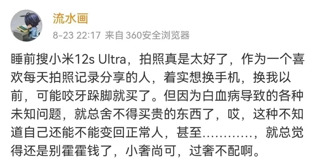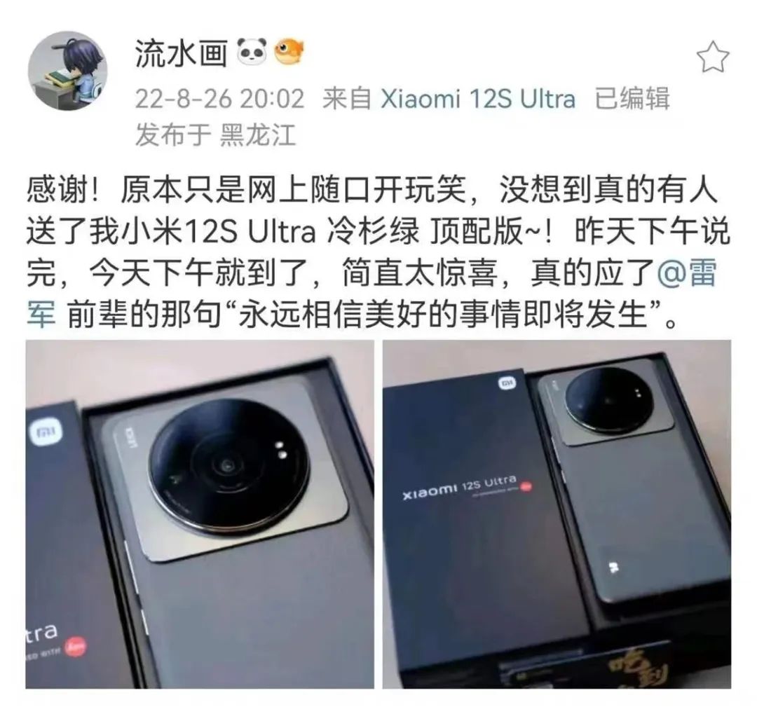 流水画是一位活跃在微博的原画画师,也是一位米粉,日常喜爱拍照和分享,由于疾病和种种原因舍不得购买当时刚刚发布的12S Ultra。教授在取得对方的同意后,就在股东群里发起了募捐。当时群里只有150个人,但很短时间内就有40位朋友参与并完成了募集,真正地让美好的事情即将发生。我当时把这件事情记录下来转发给雷总,雷总都回复说非常感动。