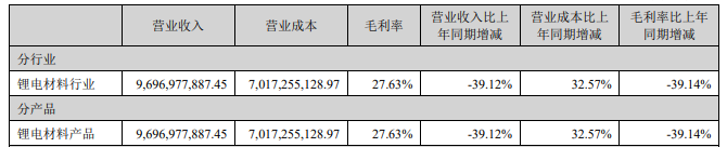 核心业务锂电材料产品在2023年实现营收96.97亿元,较2022年下滑39.12%,收入占比92.64%。受锂盐跌价影响,锂电材料产品利润端承压,2023年毛利率下滑39.14%至27.63%。