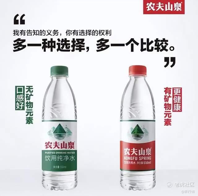 对于天然水和纯净水,农夫山泉在绿色包装和红色包装的比较图中指出,纯净水无矿物元素,口感好,天然水有矿物元素,更健康。