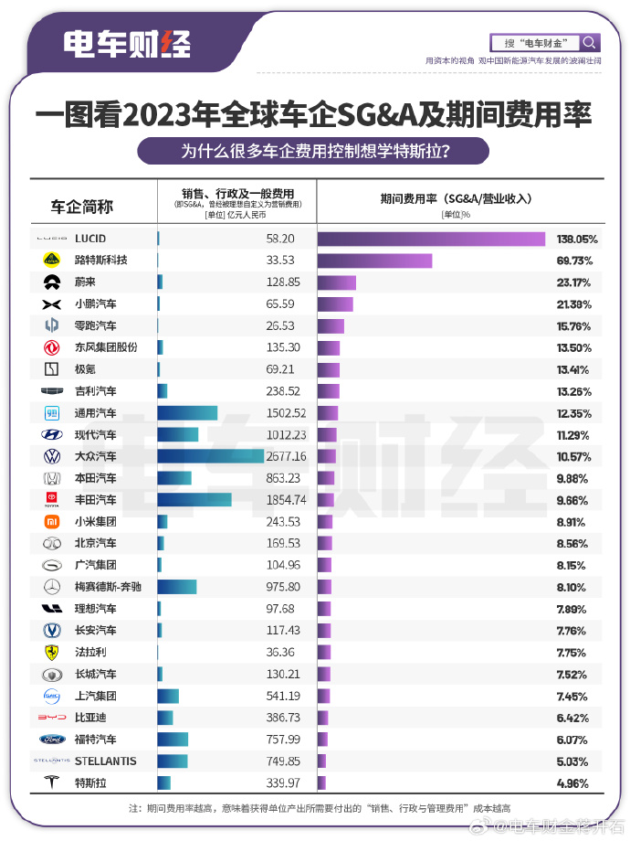 比较值得一提的是:特斯拉之外,比亚迪、长城汽车等正在高速发展的车企的三费控制的也很好。