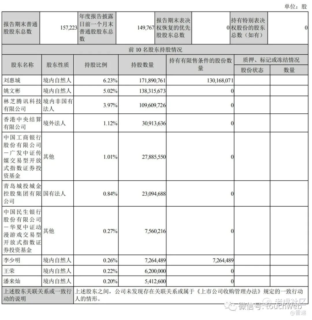 截至2022年12月31日,刘惠城持股为6.23%,姚文彬持股为5.02%,林芝腾讯科技有限公司持股为3.97%,香港中央结算有限公司持股为1.12%,中国工商银行股份有限公司-广发中证传媒交易型开放式指数证券投资基金持股为1.01%,青岛城投城金控股集团有限公司持股为0.84%;