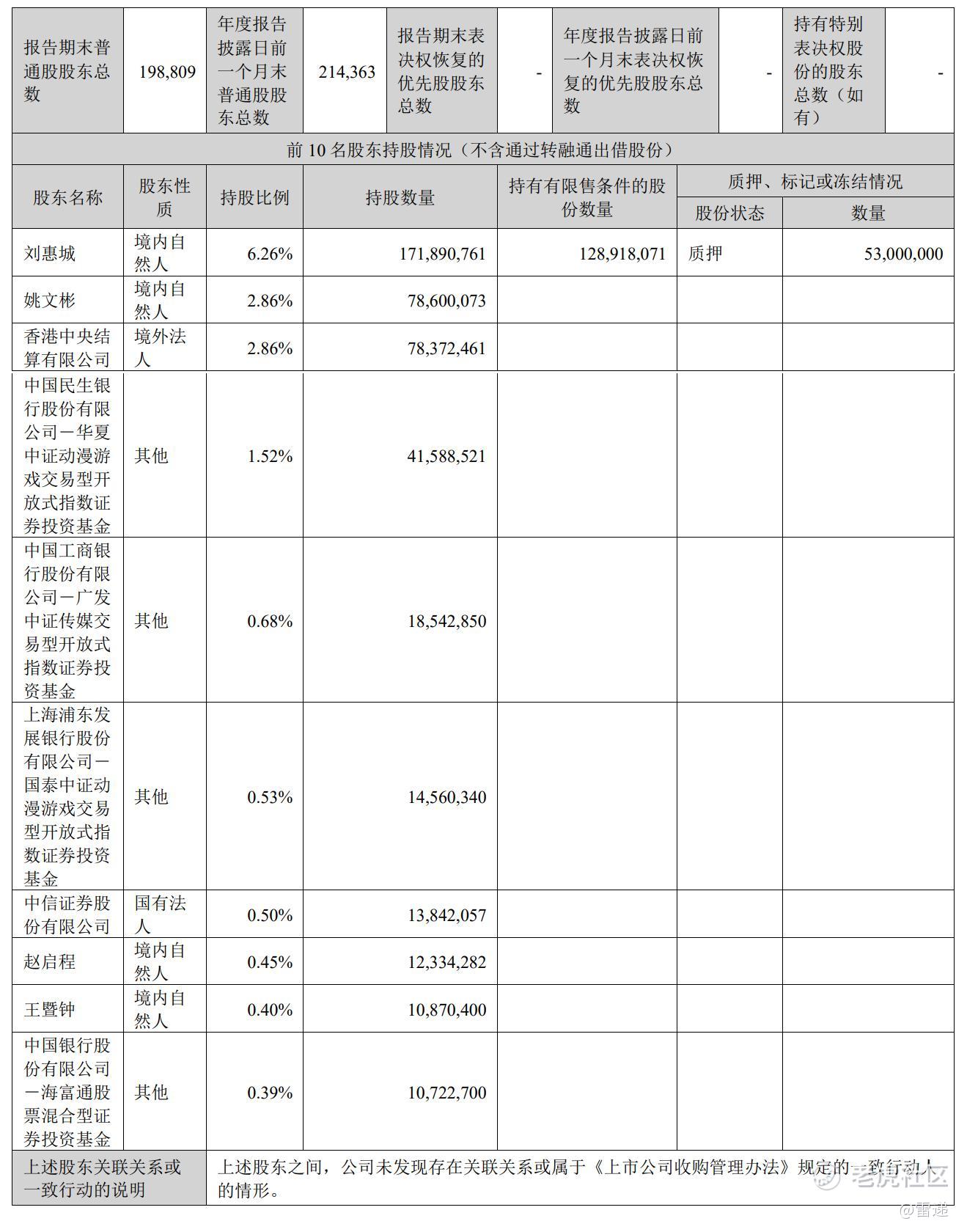截至2023年12月31日,刘惠城持股为6.26%,姚文彬持股为2.86%,香港中央结算有限公司持股为2.86%,中国民生银行股份有限公司-华夏中证动漫游戏交易型开放式指数证券投资基金持股1.52%,中国工商银行股份有限公司-广发中证传媒交易型开放式指数证券投资基金持股为0.68%;
