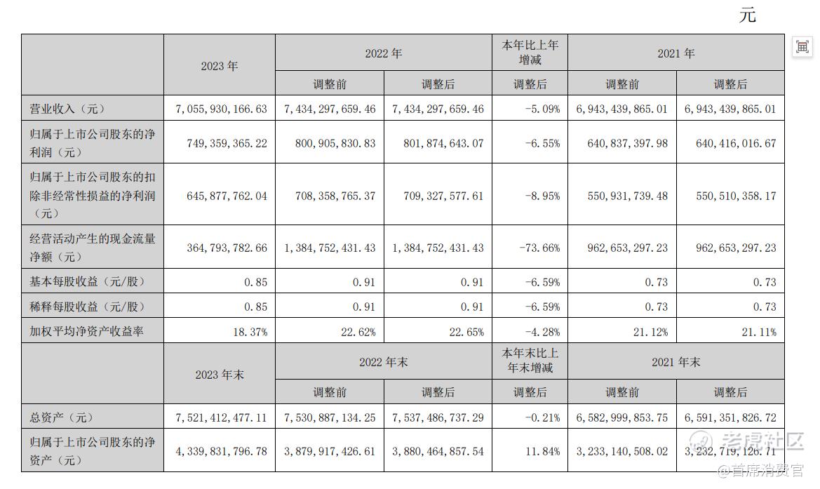 4月25日晚,三全食品发布年度业绩报告称,2023年营收为70.56亿元,同比减少5.09%;归属于上市公司股东的净利润为7.49亿元,同比减少6.55%。这是三全食品2008年上市以来营收首降。