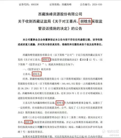 4月25日,上交所对西藏珠峰资源股份有限公司(600338.SH) (简称“西藏珠峰”)及有关责任人予以监管警示,称上市公司公告信息披露不准确,反映出公司日常信息披露存在缺陷,多份公告中出现低级文字错误,造成较大影响。此前4月18日西藏珠峰一篇公告因错别字引发热议——董秘名字竟出现四个版本,分别是“胡晗东、胡哈东、胡啥东、胡眕东”。