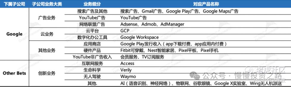 谷歌的业务范围非常广,为了方便大家了解谷歌业务情况,我找了一张图片说明(图片来源于海豚投研社):
