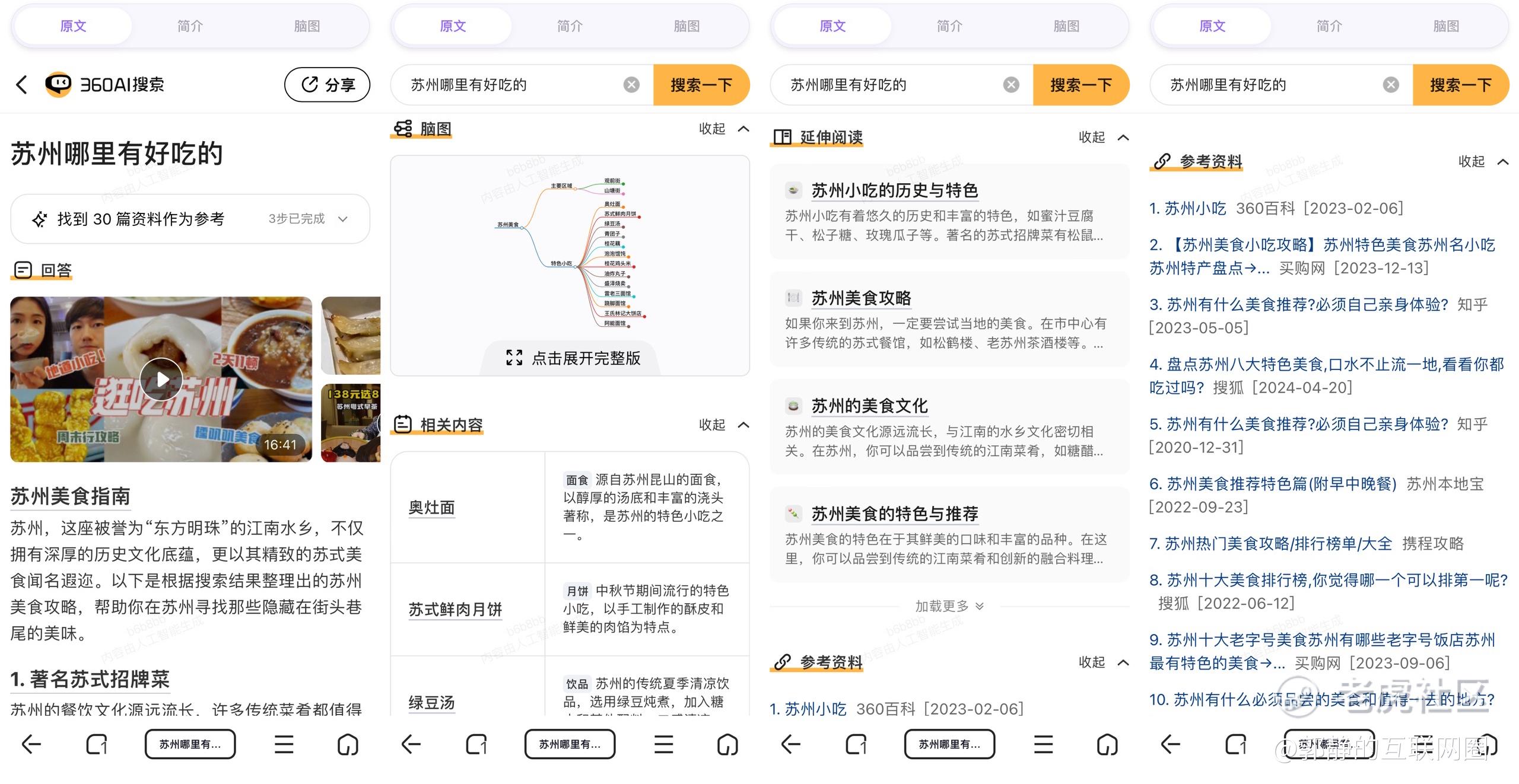 其搜索引擎为用户推荐的结果版块分别为视频回答、AI搜集并生成的结果、追问、脑图、相关内容、延伸阅读、参考资料。