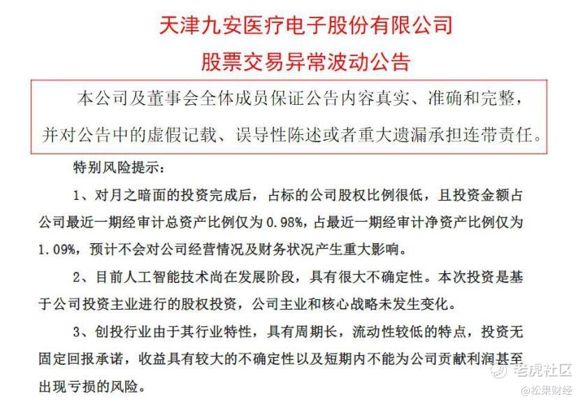 在此方面,九安医疗也有一定认识:“目前人工智能技术尚在发展阶段,具有很大不确定性。对月之暗面的投资完成后,占标的公司股权比例很低,且投资金额占公司最近一期经审计总资产比例仅为0.98%,占最近一期经审计净资产比例仅为1.09%,预计不会对公司经营情况及财务状况产生重大影响。”