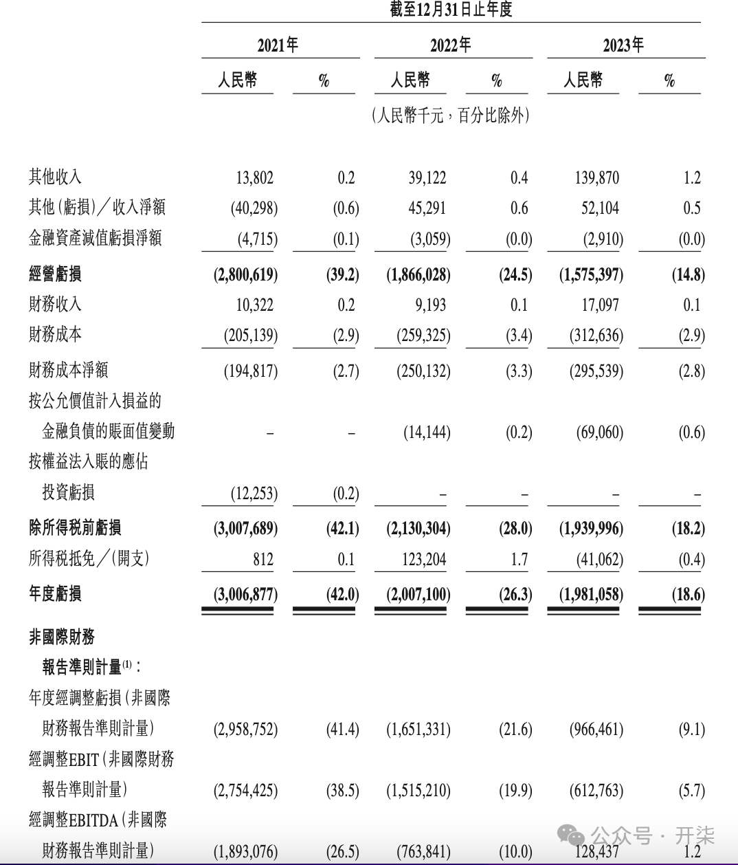 曹操出行2021年、2022年、2023年经调整亏损分别为29.59亿元、16.51亿元、9.66亿元;经调整亏损率分别为41.4%、21.6%、9.1%。