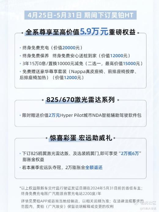 此外,在4月25日-5月31日期间下定的首任昊铂车主,全系尊享包括终身免费充电、免费保养、豪华尊享套装等在内的至高价值5.9万元重磅权益,诚意拉满。