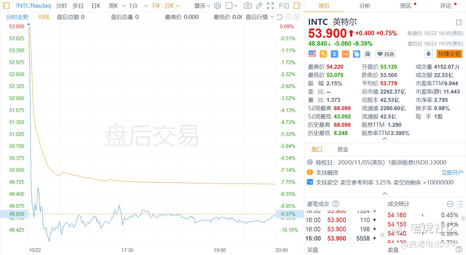 英特尔于今日美股盘后发布该公司截至2020年9月26日的第三季度财报,数据中心业务的下滑幅度超过分析师预期,导致其盘后股价暴跌近10%,收48.84美元。