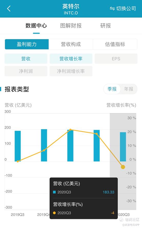 - 2020年第三季度营收为183亿美元,高于此前的七月预期,但同比降4%,以数据为中心的业务营收大幅下滑10%,虽以PC为中心的业务营收优于预期,同比小幅上扬1%。