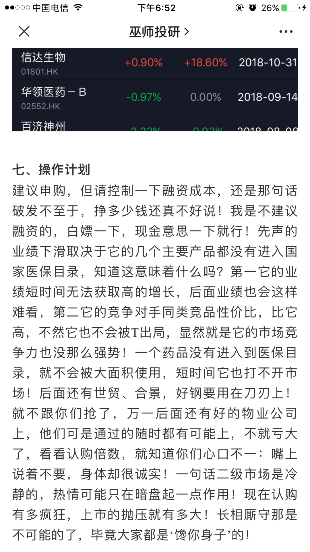 因为下午先声暗盘的表现,我把药明巨诺的申购的甲组乙组除了不能取消的都撤!不是因为我太悲观,市场本来就是畸形心理,大家抢额度都是先抢再说,好不好是其次,市场也会被这种氛围渲染,所以券商、银行利息是一涨再涨,公司估值也一提再提!