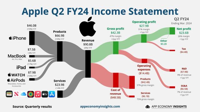 苹果第二财季收入同比下滑4.3% 至907.5亿美金,其中:
