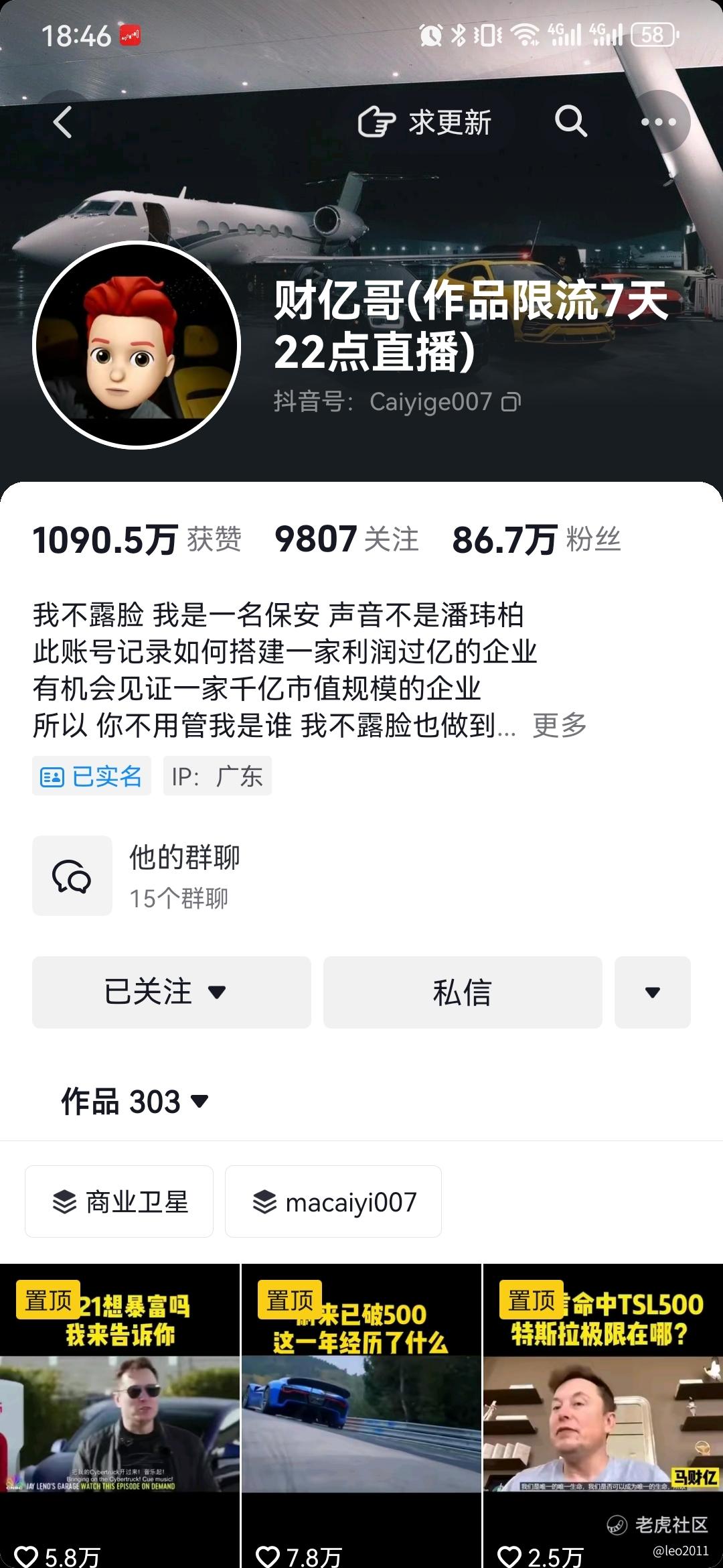 $特斯拉(TSLA)$ 抖音的财亿哥,就是骗子马财亿(割一波韭菜就改一个名,还叫过马斯达克),百度搜了一下还真是,这个嘴炮坑了不少人,专门给某些股找接盘侠,21年初最高点忽悠大家买中概股,现在还在骗9980 不知道的自行百度,别被骗