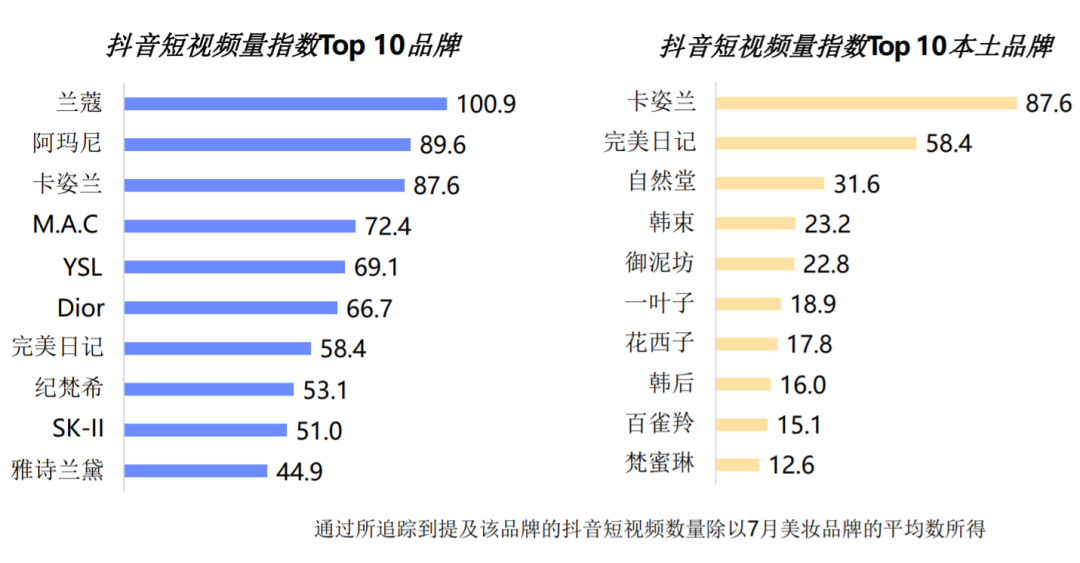 2020年7月的美妆行业报告显示完美日记在抖音短视频量指数本土品牌排名中名列第二,仅次于老牌国货品牌卡姿兰。