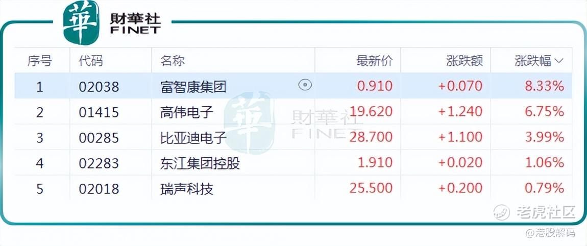 受此消息提振,5月6日,港股苹果概念板块出现拉升行情。其中, $富智康集团(02038)$ 涨8.33%,高伟电子(01415.HK)涨6.75%,比亚迪电子(00285.HK)涨3.99%。