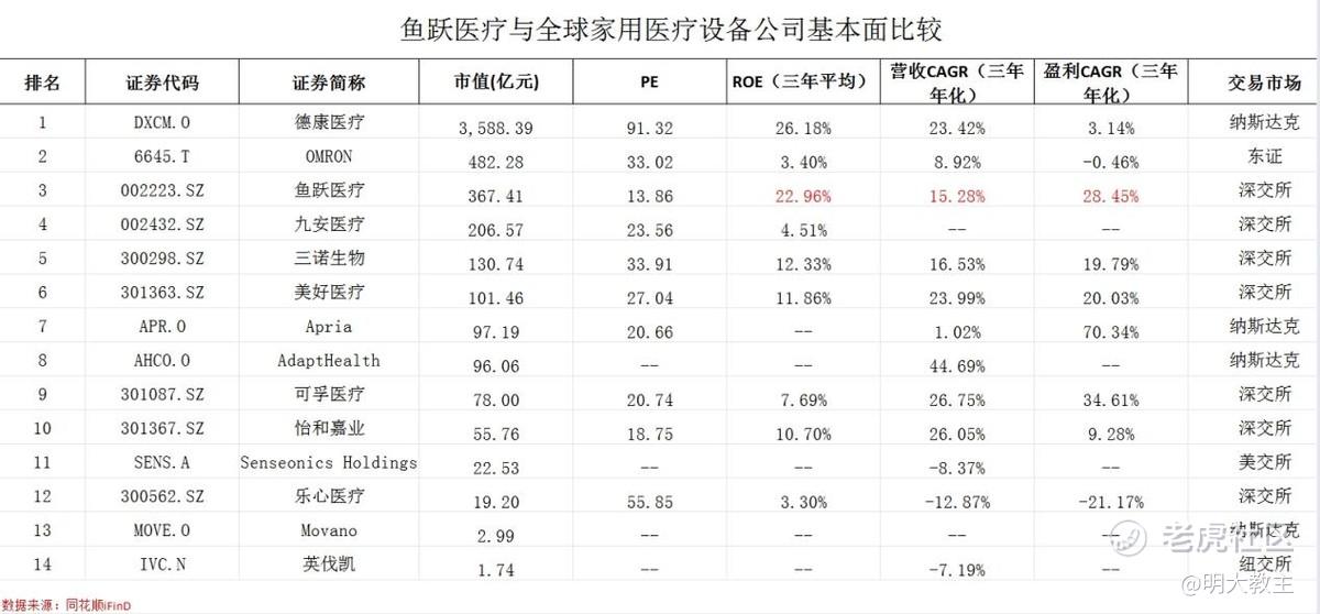 截止4月26日,在与全球居家医疗设备上市公司基本面比较中,鱼跃医疗ROE、营收/净利润复合增速均排名前列,市盈率则处于最低一档。