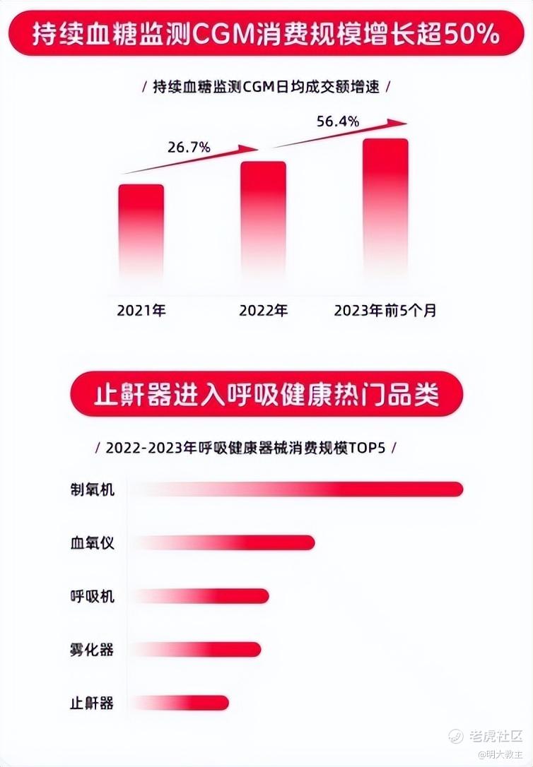 天猫健康发布的《诊疗家庭化消费趋势洞察》表明,2023年持续血糖监测设备消费规模增长超50%,制氧机、呼吸机、雾化器规模排名前列。