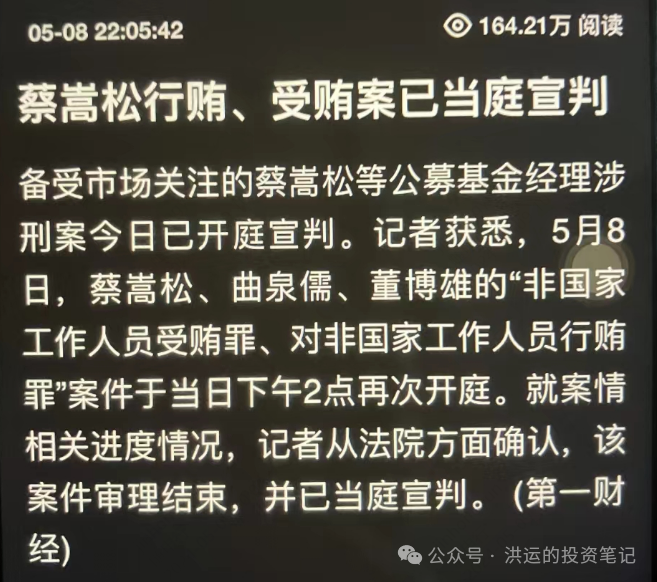大家好,我是你们的金叔,昨晚一则新闻震惊了基金圈子,在小范围激起了不小的涟漪。曾经的公募一个蔡嵩松以受贿罪被判刑(案号为(2024)浙07刑初1号),注意是刑事案件。表面上是受贿,实际上揭露的是从14-17,17-21年,两段公募黄金时代背后的肮脏故事,下面,请听我婉婉道来。