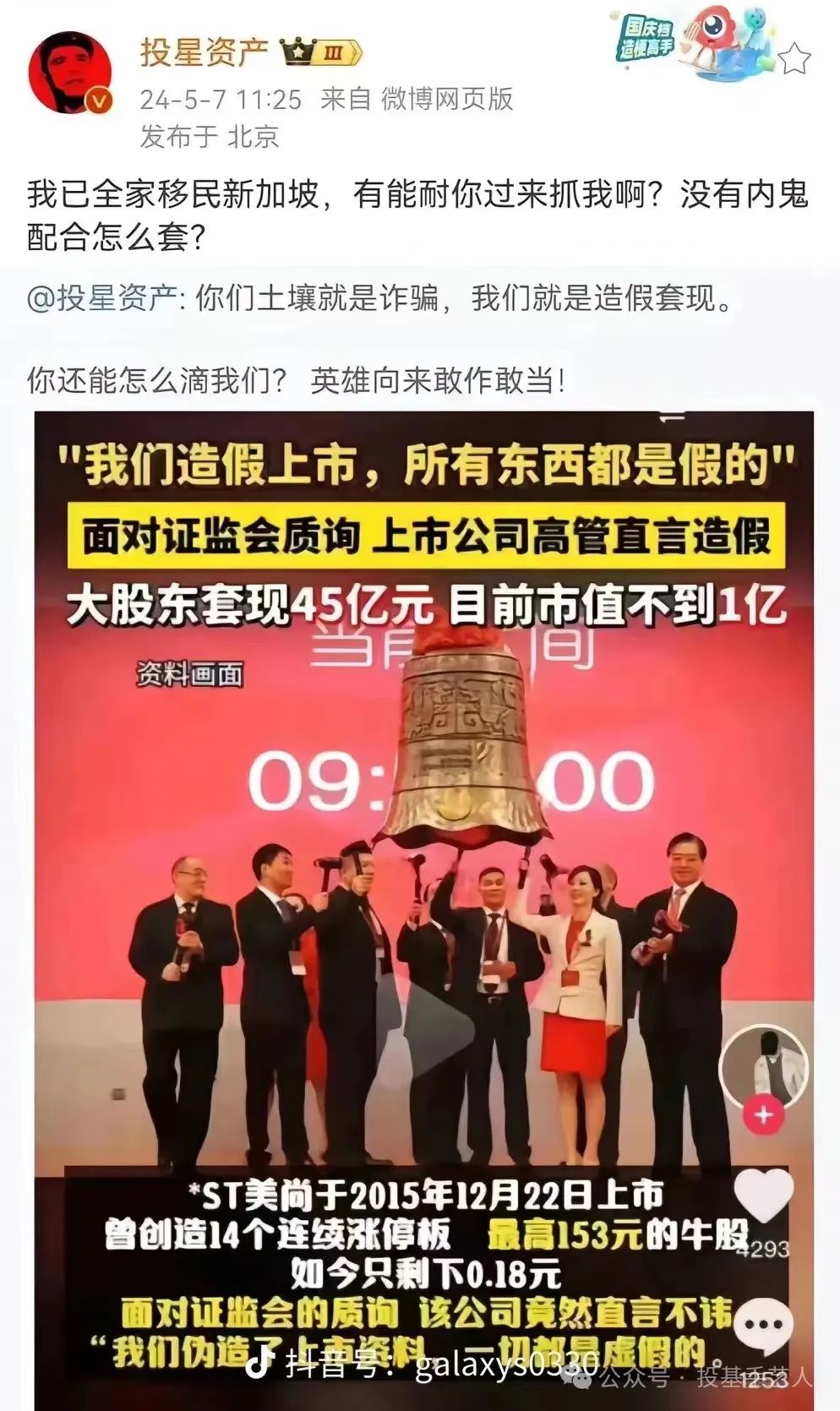 ST退市的股票多了去了,但这么嚣张的也是少见。老板说:就是“明骗”,你能把我咋的?几十亿元就这么套现,然后润到新加坡去了。难道“坡县”真是法外之地?记得前不久一个私募也是明目张胆地逃到了新加坡。