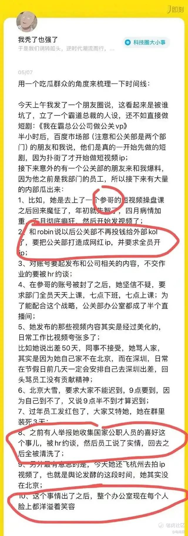 此前有一位即刻网友爆料,称璩静上了一门短视频操盘课,回来后就开始大搞短视频,甚至跟李彦宏说,以后百度公关部不再投钱给外部kol,要把公关部打造成网红IP,并要求全员拍短视频当网红,把办公室变成了半个直播间。