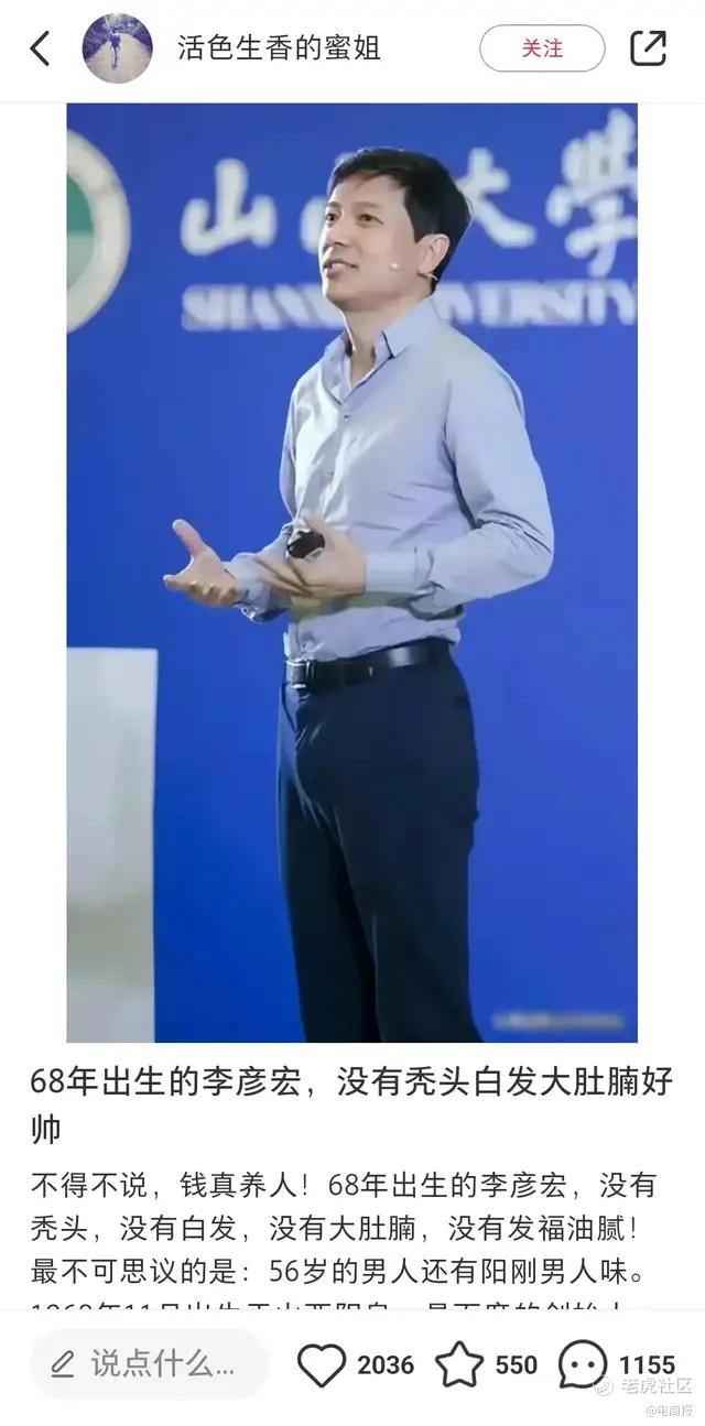 其次,李彦宏的颜值能打。当网红“颜值”是很重要的,一个好的形象有时胜过千言万语,路人“眼缘”上就胜过对手一筹。别看李彦宏已经年近60,其形象气质比同龄的其他企业家要好不少,甚至社交媒体上还有李彦宏的“迷妹”欣赏他的颜值。
