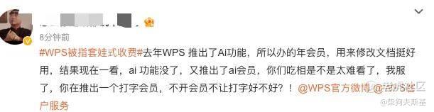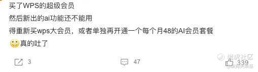「去年WPS 推出了Ai功能,所以办的年会员,用来修改文档挺好用,结果现在一看,ai 功能没了,又推出了ai会员,你们吃相是不是太难看了,我服了」