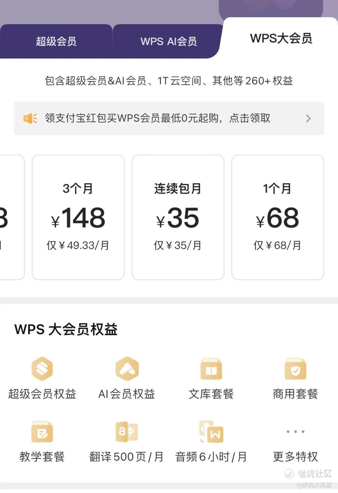 一直用不起国内免费办公软件的小柴,第一时间下载了个WPS,打开一看,如今WPS的会员,之前咱们熟悉的稻壳会员之类的叫法没有了,现在有三种,分别为:超级会员、WPSAI会员和WPS大会员。