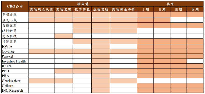 1、全球型CRO巨头,如昆泰、科文斯、精鼎等,具有全球业务网点以及国际多中心临床研究能力;